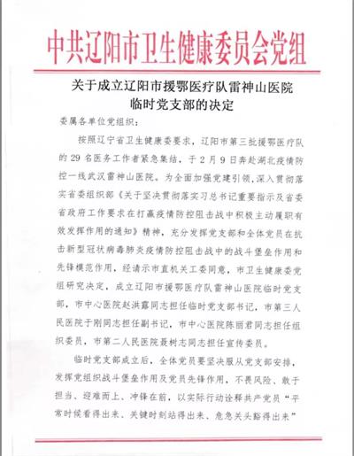 辽阳市援鄂医疗队雷神山医院临时党支部成立