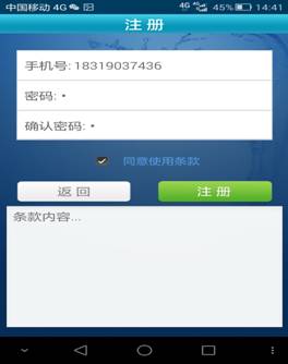 进入系统后点击“注册” 按钮,进入注册界面。注册账号为本手机号码。同一手机号只能注册一次。