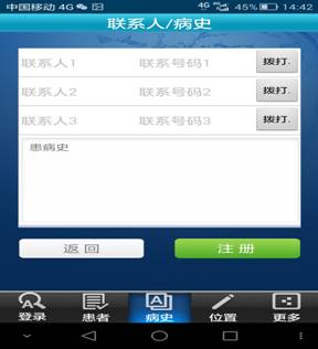 进入病史登记界面,能够登记1-3个联系人电话。包括急救病历史。如果使用其中一个联系人的号码拨打120,急救中心也能够立即在系统中显示报警人相关登记信息。点击 “注册”按钮完成联系人及病患史登记。登记的病史信息也能在急救中心显示。