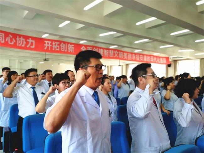 “我庄严宣誓,自觉维护医学的尊严和神圣,敬佑生命,平等仁爱,患者至上,真诚守信,精进审慎......“,会上,医生代表举起右拳,一起重温医师誓词。铮铮誓言是奋进的决心,更是庄严的承诺。