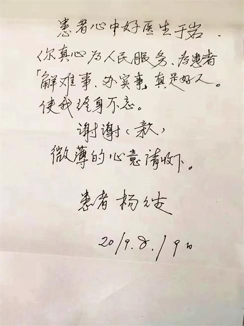 于岩本没把这事放在心上,但8月19日上午,老人家带着一个装有毛巾、香皂、洗发水的小包,特意前来医院感谢,执意让于岩收下这份小礼物。怕老人家着急的于岩,不得已暂时收下小包裹放在护士长安月华手里。却不想,午休时护士长打开包裹一看,最底层还有一个信封,里面装着一份手写的感谢信及200元钱。这下,于岩可急了:怎么能收老人家的钱呢?几经周折,最终院纪委联系上老人家,退回了钱物。