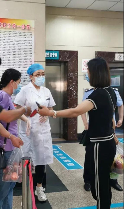 在此基础上,加强医院入口管控和服务。医院组织机关、工勤和病房医护人员组成志愿者严把医院各出入口,有效控制入院人员数量。随着疫情形势的不断变化,医院入口安检方式方法也在不断调整,目前医院分别设立了“门诊患者、急诊患者、住院患者及陪护人员、本院员工、急诊检查”五个分类通道,均有志愿者负责体温检测、行程码查验及流行病学表填写,分类层层把关,保障了不同人群在院内的合理流动。