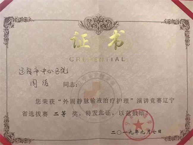 9月7日,在辽宁省护理学会外周静脉输液治疗护理演讲竞赛暨中华护理学会静脉输液治疗演讲比赛选拔赛中,我院代表周洁以优异成绩在20个代表队中脱颖而出,获得二等奖,并被辽宁省护理学会推选参加中华护理学会静脉输液治疗大赛的预赛。