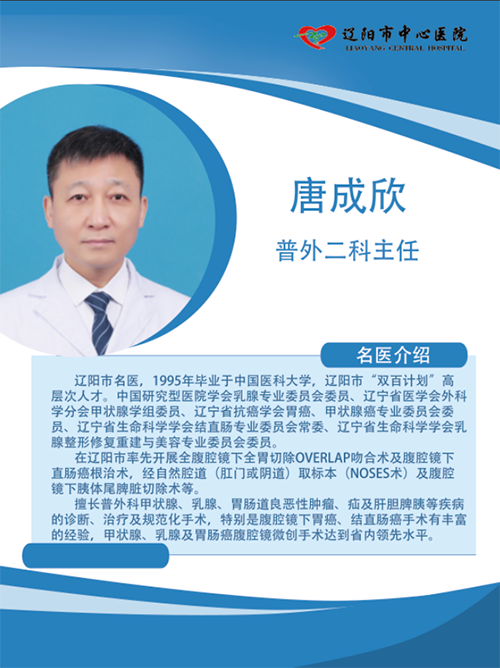 普外科是外科系统中最大的专科,以外科手术为主要手段,所囊括的疾病几乎涵盖了腹腔内所有重要脏器。虽名为普通外科,却一点都不普通。“技术过硬,为患者治好病,才是称职的医生”这是唐成欣常说的一句话。参加工作25年来,唐成欣不仅熟练掌握了普外科医疗领域各种基本技术技能,还瞄准科技前沿,吸纳当今医疗尖端科技成果,提高自主创新能力。为了让自己的技术水平更高,他先后赴广州、上海、北京等国内一流医院进修、深造,将国内的先进的腹腔镜技术带回辽阳,先后开展了腹腔镜下直肠癌根治术、腹腔镜下腹股沟疝修补术、腹腔镜下辅助胃癌根治性切除术,而全腹腔镜下全胃切除吻合术更是填补了我市空白,达到省内领先水平,为众多患者减轻痛苦,带来福音。辽阳市中心医院普外二科主任 唐成欣